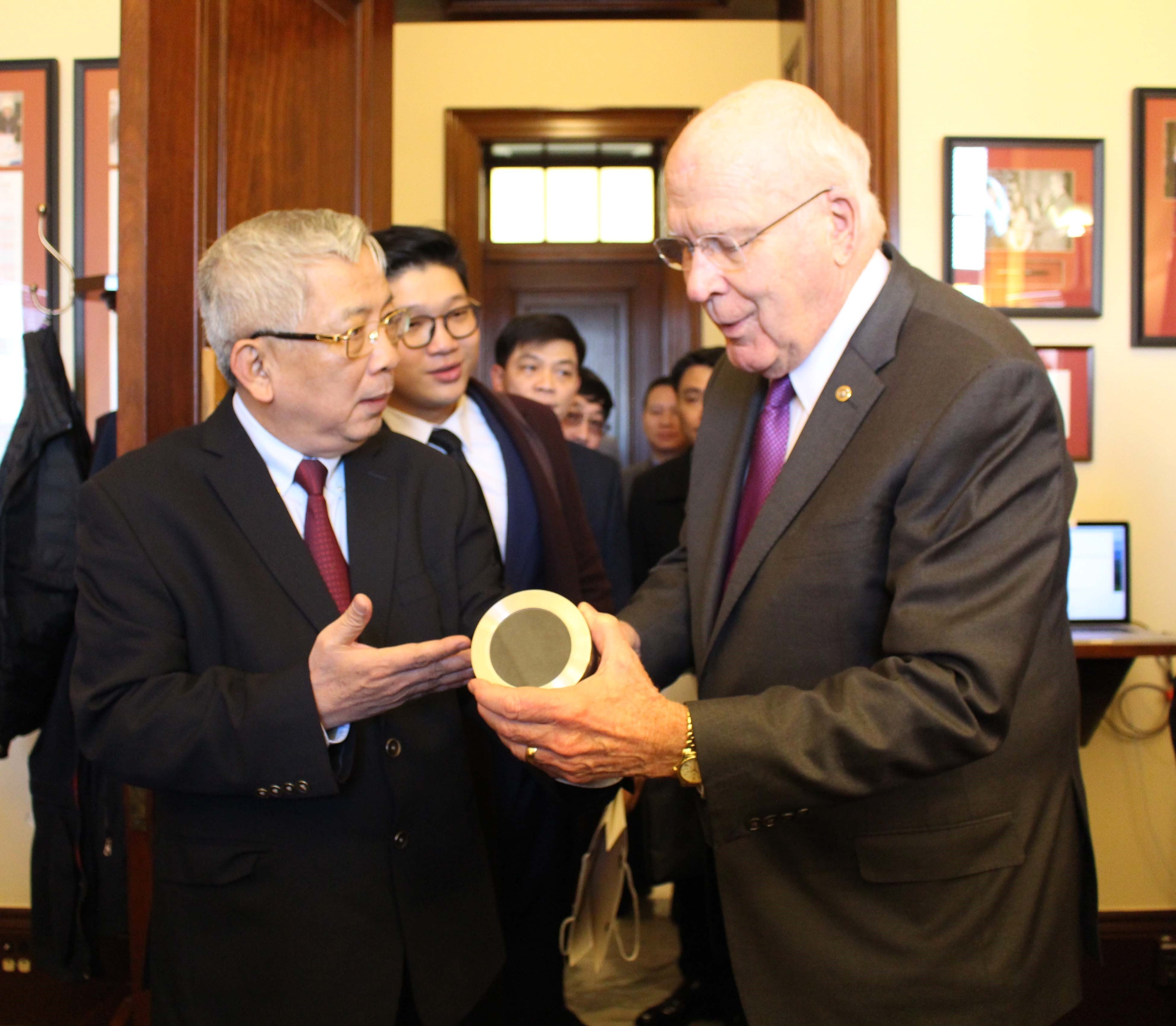 Thượng nghĩ sĩ Patrick Leahy bày tỏ sự cảm ơn đối với Thượng tướng Nguyễn Chí Vịnh vì sự đón tiếp trong những lần ông sang Việt Nam làm việc.